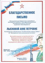 2025 год, Благодарственное письмо за плодотворное сотрудничество и большой вклад в организацию и проведение творческого вечера "Мужество, доблесть и честь"