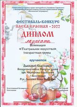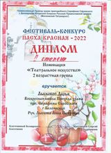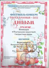 2022, Диплом 2 степени фестиваля - конкурса "Пасха Красная -2022", в номинации "Театральное искусство", 2 возрастная группа