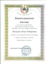 2019, Благословенное письмо за труды в деле утверждения Православной Веры и духовно-нравственное научение подрастающего поколения