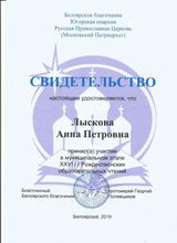 2019, Свидетельство Белоярского Благочиния Югорской Епархии о том, что приняла участие в муниципальном этапе ХVIII Рождественских образовательных чтений