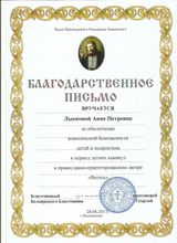 2017, Благодарственное письмо от Храма прп. Серафима Саровского за обеспечение комплексной безопасности детей и подростков в период летних каникул в православном-ориентированном лагере "Витязь"