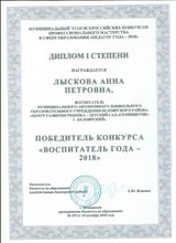 2018, Диплом 1 степени муниципального этапа Всероссийских конкурсов профессионального мастерства в сфере образования "Педагог года - 2018", победитель конкурса "Воспитатель года - 2018"