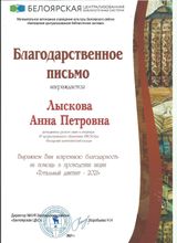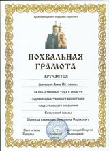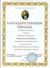 2018, Благодарственное письмо от Храма прп. Серафима Саровского за усердные труды в сфере духовно-нравственного развития и воспитания детей Белоярского района