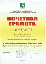 2019, Почетная грамота Комитета по образованию Администрации Белоярского района за высокое профессиональное мастерство, большой личный вклад в формирование нравственных основ детей