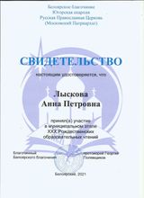 2021, Свидетельство Белоярского Благочиния Югорской Епархии о том, что приняла участие в муниципальном этапе ХХХ Рождественских образовательных чтений