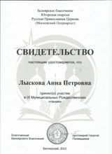 2023, Свидетельство Белоярского Благочиния Югорской Епархии о том, что приняла участие в муниципальном этапе IХ Муниципальных Рождественских чтениях