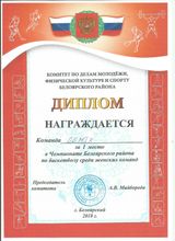 2018, Диплом за 1 место от комитета по делам молодежи, ФК и спорту Белоярского района в чемпионате Белоярского района по баскетболу среди женских команд