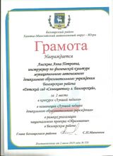2019, Грамота за 2 место в конкурсе "Лучший педагог", в номинации "Лучший педагог ДОУ" в рамках реализации национального проекта "Образование" в Белоярском районе
