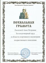2018, Похвальная грамота от Храма прп. Серафима Саровского за плодотворный труд в области спортивного воспитания подрастающего поколения